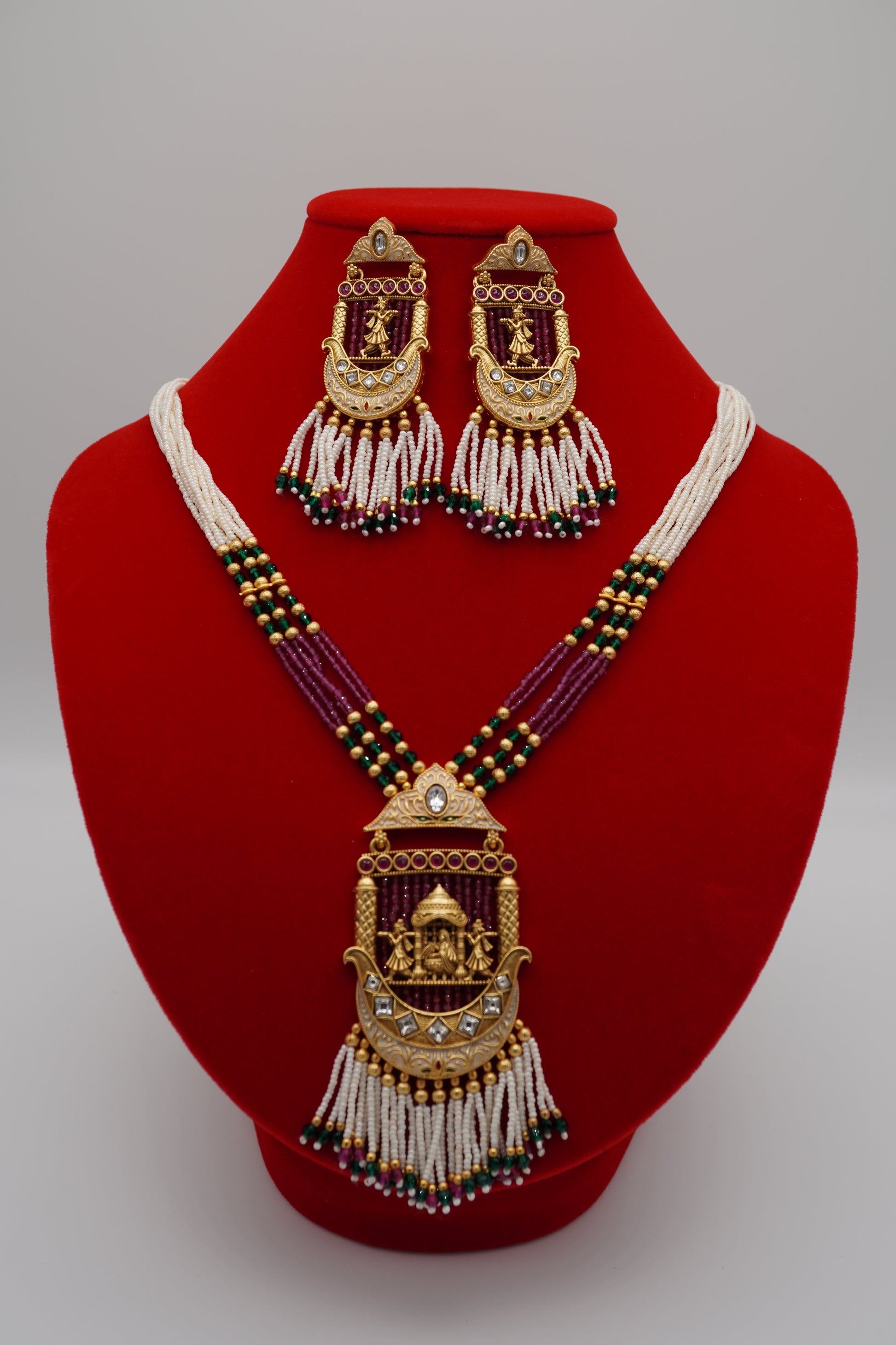 Embrace the elegance of tradition with our "Regal Tradition Necklace Set." This stunning piece features intricate gold detailing paired with vibrant beads, perfectly capturing the essence of classic Indian artistry. The accompanying earrings complete the look, making it ideal for any special occasion. Wear this set to add a touch of royal charm to your ensemble and celebrate your heritage with style.